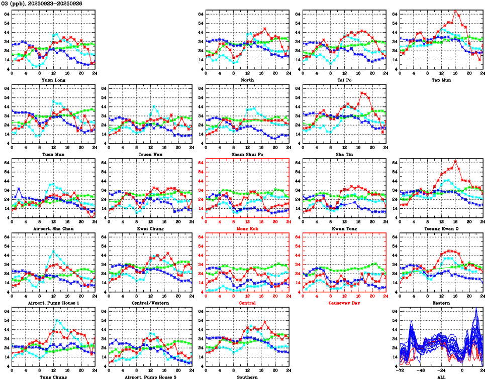 Air Quality Data Time Series for O3 (2025/09/26) | ( Line colors: Day -3 Day -2 Day -1 Current day ) | 2D Map Current AQHI |
