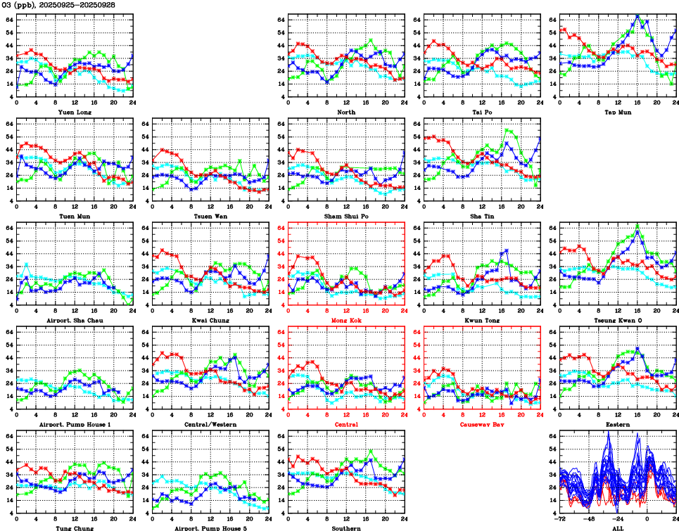 Air Quality Data Time Series for O3 (2025/09/28) | ( Line colors: Day -3 Day -2 Day -1 Current day ) | 2D Map Current AQHI |