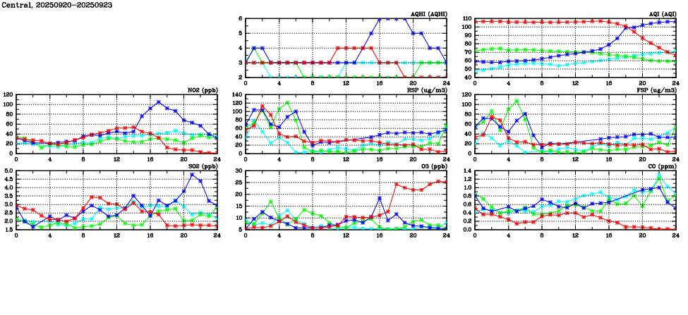 Air Quality Data Time Series in Central (2025/09/23) | ( Line colors: Day -3 Day -2 Day -1 Current day ) | 2D Map Current AQHI |