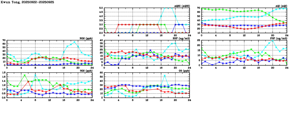 Air Quality Data Time Series in Kwun Tong (2025/09/25) | ( Line colors: Day -3 Day -2 Day -1 Current day ) | 2D Map Current AQHI |
