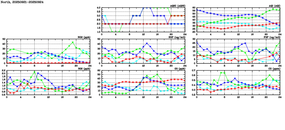 Air Quality Data Time Series in North (2025/09/24) | ( Line colors: Day -3 Day -2 Day -1 Current day ) | 2D Map Current AQHI |