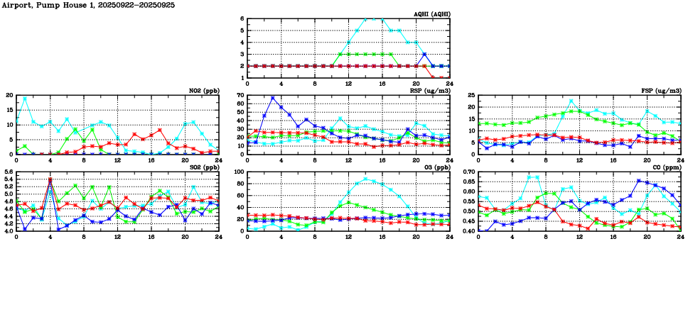 Air Quality Data Time Series in Airport, Pump House 1 (2025/09/25) | ( Line colors: Day -3 Day -2 Day -1 Current day ) | 2D Map Current AQHI |