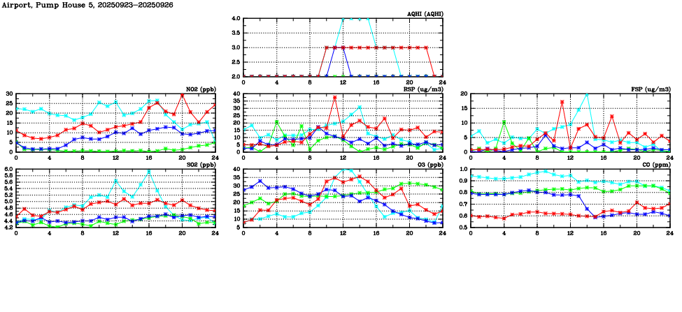 Air Quality Data Time Series in Airport, Pump House 5 (2025/09/26) | ( Line colors: Day -3 Day -2 Day -1 Current day ) | 2D Map Current AQHI |