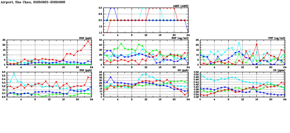 Air Quality Data Time Series in Airport, Sha Chau (2025/09/26) | ( Line colors: Day -3 Day -2 Day -1 Current day ) | 2D Map Current AQHI |