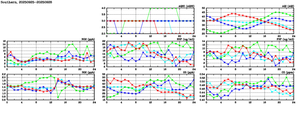 Air Quality Data Time Series in Southern (2025/09/28) | ( Line colors: Day -3 Day -2 Day -1 Current day ) | 2D Map Current AQHI |
