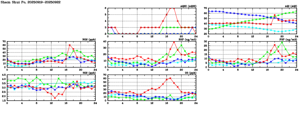 Air Quality Data Time Series in Sham Shui Po (2025/09/22) | ( Line colors: Day -3 Day -2 Day -1 Current day ) | 2D Map Current AQHI |