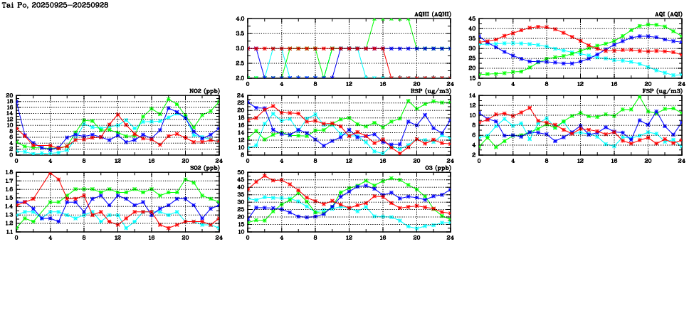 Air Quality Data Time Series in Tai Po (2025/09/28) | ( Line colors: Day -3 Day -2 Day -1 Current day ) | 2D Map Current AQHI |