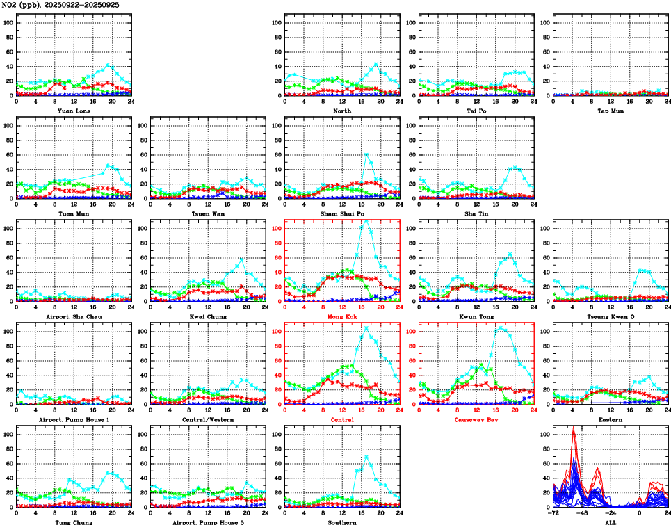 Air Quality Data Time Series for NO2 (2025/09/25) | ( Line colors: Day -3 Day -2 Day -1 Current day ) | 2D Map Current AQHI |