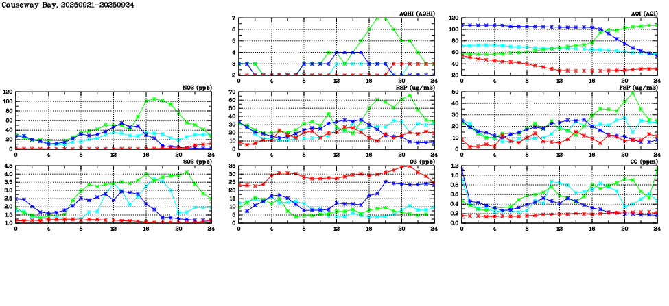 Air Quality Data Time Series in Causeway Bay (2025/09/24) | ( Line colors: Day -3 Day -2 Day -1 Current day ) | 2D Map Current AQHI |