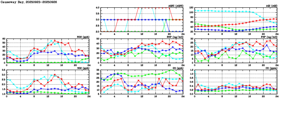 Air Quality Data Time Series in Causeway Bay (2025/09/26) | ( Line colors: Day -3 Day -2 Day -1 Current day ) | 2D Map Current AQHI |