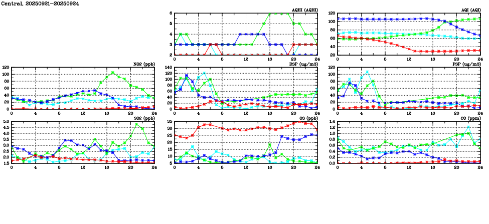 Air Quality Data Time Series in Central (2025/09/24) | ( Line colors: Day -3 Day -2 Day -1 Current day ) | 2D Map Current AQHI |