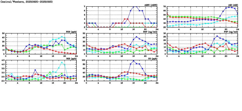 Air Quality Data Time Series in Central/Western (2025/09/23) | ( Line colors: Day -3 Day -2 Day -1 Current day ) | 2D Map Current AQHI |