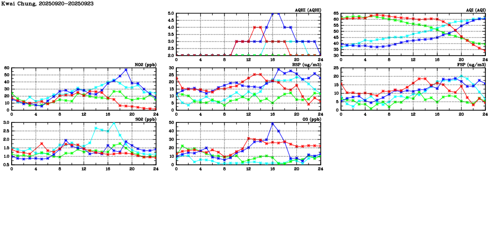Air Quality Data Time Series in Kwai Chung (2025/09/23) | ( Line colors: Day -3 Day -2 Day -1 Current day ) | 2D Map Current AQHI |