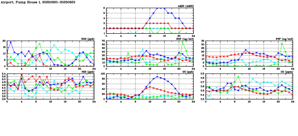 Air Quality Data Time Series in Airport, Pump House 1 (2025/09/23) | ( Line colors: Day -3 Day -2 Day -1 Current day ) | 2D Map Current AQHI |