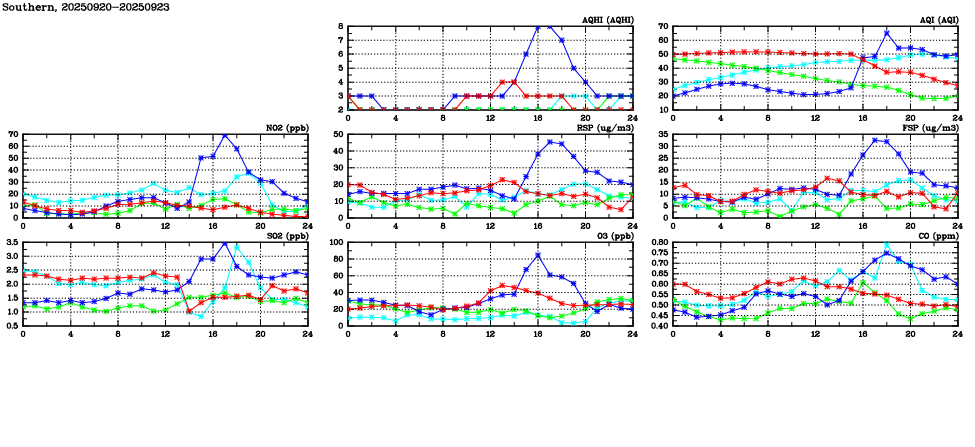 Air Quality Data Time Series in Southern (2025/09/23) | ( Line colors: Day -3 Day -2 Day -1 Current day ) | 2D Map Current AQHI |