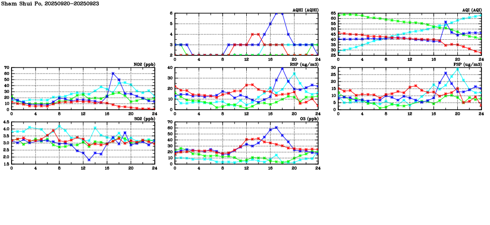 Air Quality Data Time Series in Sham Shui Po (2025/09/23) | ( Line colors: Day -3 Day -2 Day -1 Current day ) | 2D Map Current AQHI |