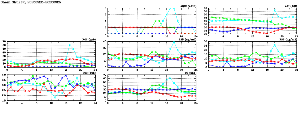Air Quality Data Time Series in Sham Shui Po (2025/09/25) | ( Line colors: Day -3 Day -2 Day -1 Current day ) | 2D Map Current AQHI |