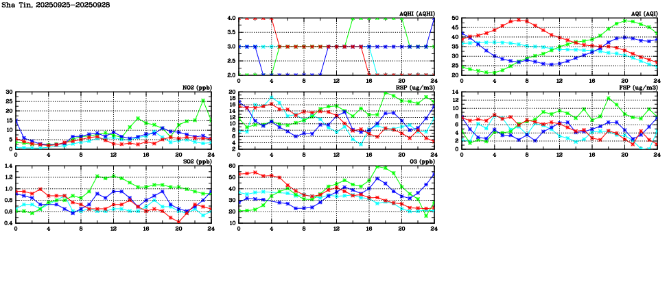 Air Quality Data Time Series in Sha Tin (2025/09/28) | ( Line colors: Day -3 Day -2 Day -1 Current day ) | 2D Map Current AQHI |