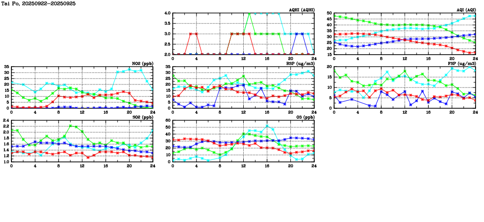 Air Quality Data Time Series in Tai Po (2025/09/25) | ( Line colors: Day -3 Day -2 Day -1 Current day ) | 2D Map Current AQHI |