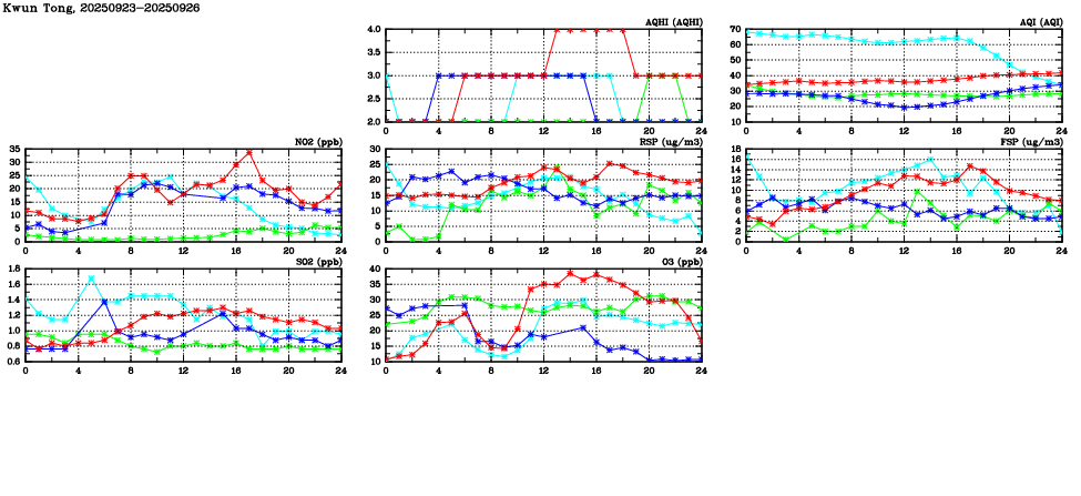 Air Quality Data Time Series in Kwun Tong (2025/09/26) | ( Line colors: Day -3 Day -2 Day -1 Current day ) | 2D Map Current AQHI |