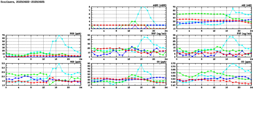 Air Quality Data Time Series in Southern (2025/09/25) | ( Line colors: Day -3 Day -2 Day -1 Current day ) | 2D Map Current AQHI |