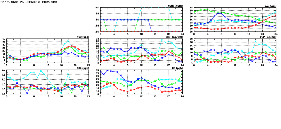 Air Quality Data Time Series in Sham Shui Po (2025/09/29) | ( Line colors: Day -3 Day -2 Day -1 Current day ) | 2D Map Current AQHI |
