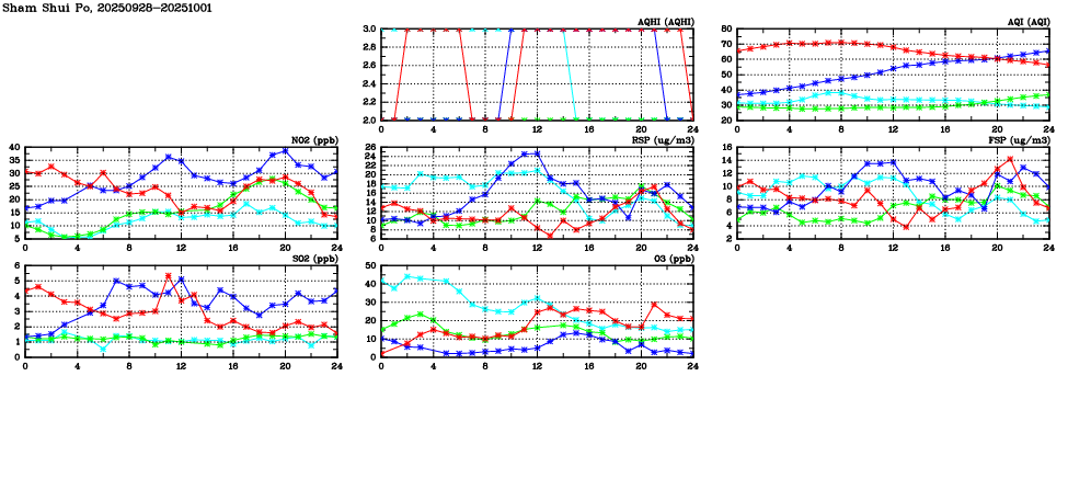 Air Quality Data Time Series in Sham Shui Po (2025/10/01) | ( Line colors: Day -3 Day -2 Day -1 Current day ) | 2D Map Current AQHI |