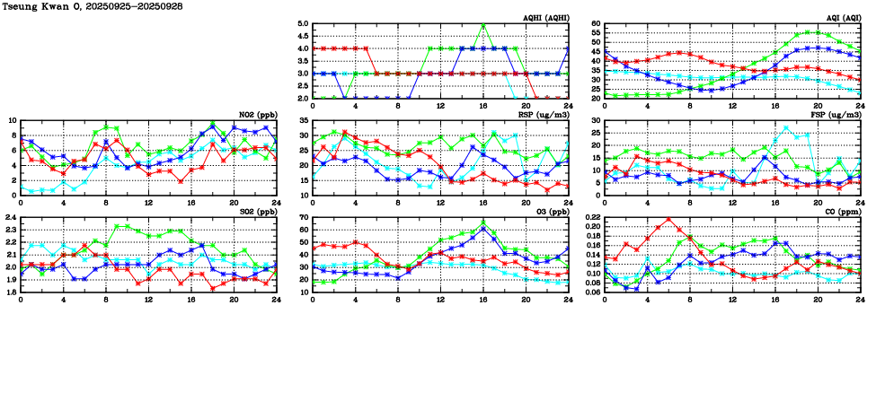 Air Quality Data Time Series in Tseung Kwan O (2025/09/28) | ( Line colors: Day -3 Day -2 Day -1 Current day ) | 2D Map Current AQHI |