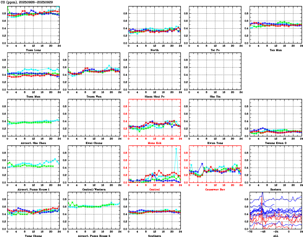 Air Quality Data Time Series for CO (2025/09/29) | ( Line colors: Day -3 Day -2 Day -1 Current day ) | 2D Map Current AQHI |