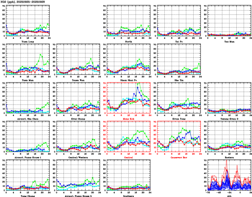Air Quality Data Time Series for NO2 (2025/09/28) | ( Line colors: Day -3 Day -2 Day -1 Current day ) | 2D Map Current AQHI |