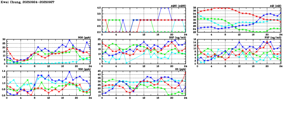 Air Quality Data Time Series in Kwai Chung (2025/09/27) | ( Line colors: Day -3 Day -2 Day -1 Current day ) | 2D Map Current AQHI |