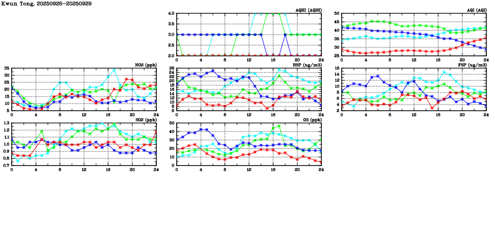 Air Quality Data Time Series in Kwun Tong (2025/09/29) | ( Line colors: Day -3 Day -2 Day -1 Current day ) | 2D Map Current AQHI |