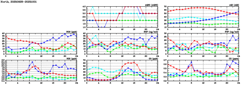 Air Quality Data Time Series in North (2025/10/01) | ( Line colors: Day -3 Day -2 Day -1 Current day ) | 2D Map Current AQHI |