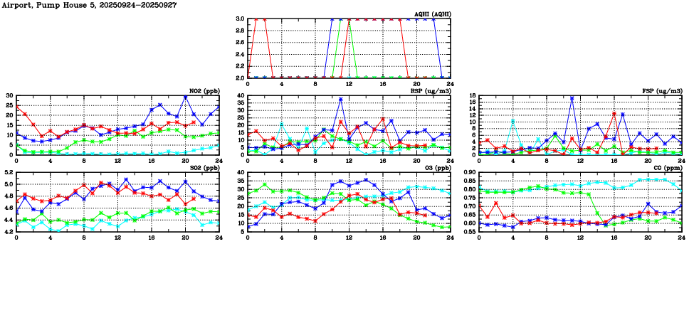 Air Quality Data Time Series in Airport, Pump House 5 (2025/09/27) | ( Line colors: Day -3 Day -2 Day -1 Current day ) | 2D Map Current AQHI |
