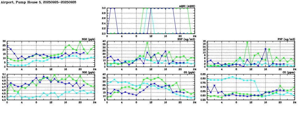 Air Quality Data Time Series in Airport, Pump House 5 (2025/09/28) | ( Line colors: Day -3 Day -2 Day -1 Current day ) | 2D Map Current AQHI |