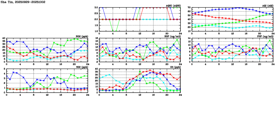 Air Quality Data Time Series in Sha Tin (2025/10/02) | ( Line colors: Day -3 Day -2 Day -1 Current day ) | 2D Map Current AQHI |