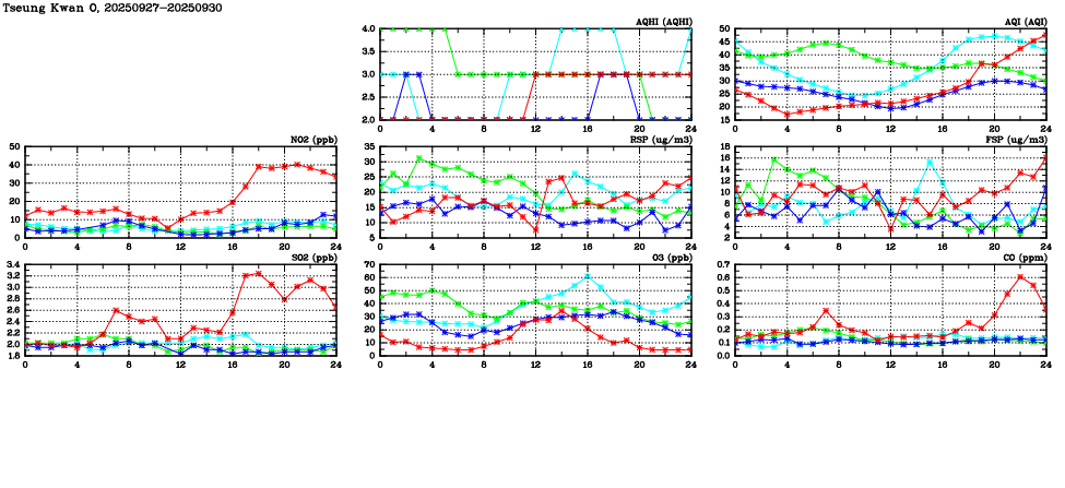 Air Quality Data Time Series in Tseung Kwan O (2025/09/30) | ( Line colors: Day -3 Day -2 Day -1 Current day ) | 2D Map Current AQHI |