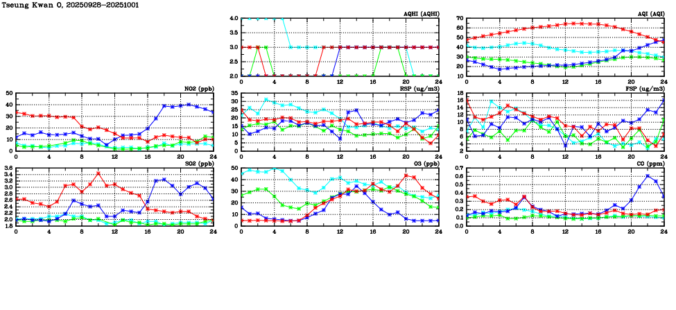 Air Quality Data Time Series in Tseung Kwan O (2025/10/01) | ( Line colors: Day -3 Day -2 Day -1 Current day ) | 2D Map Current AQHI |