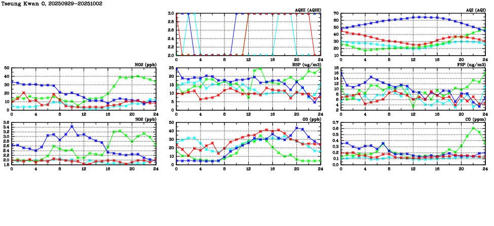 Air Quality Data Time Series in Tseung Kwan O (2025/10/02) | ( Line colors: Day -3 Day -2 Day -1 Current day ) | 2D Map Current AQHI |