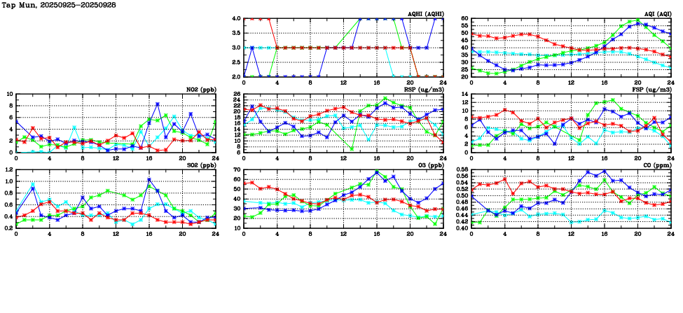 Parameters: | AQHI | AQI | RSP | FSP | NO2 | SO2 | O3 | CO | Temp | WS | WD |
