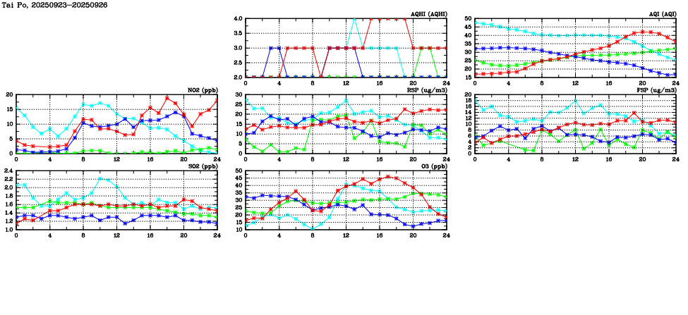 Air Quality Data Time Series in Tai Po (2025/09/26) | ( Line colors: Day -3 Day -2 Day -1 Current day ) | 2D Map Current AQHI |