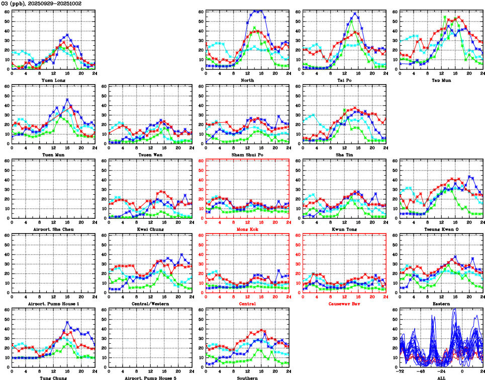 Air Quality Data Time Series for O3 (2025/10/02) | ( Line colors: Day -3 Day -2 Day -1 Current day ) | 2D Map Current AQHI |