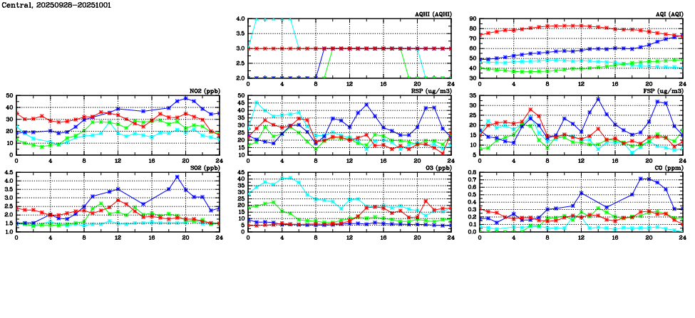 Air Quality Data Time Series in Central (2025/10/01) | ( Line colors: Day -3 Day -2 Day -1 Current day ) | 2D Map Current AQHI |