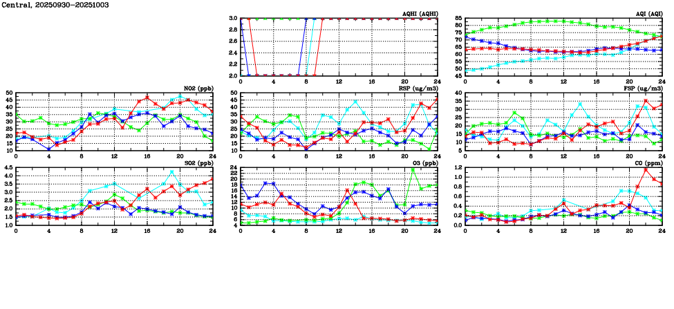 Air Quality Data Time Series in Central (2025/10/03) | ( Line colors: Day -3 Day -2 Day -1 Current day ) | 2D Map Current AQHI |