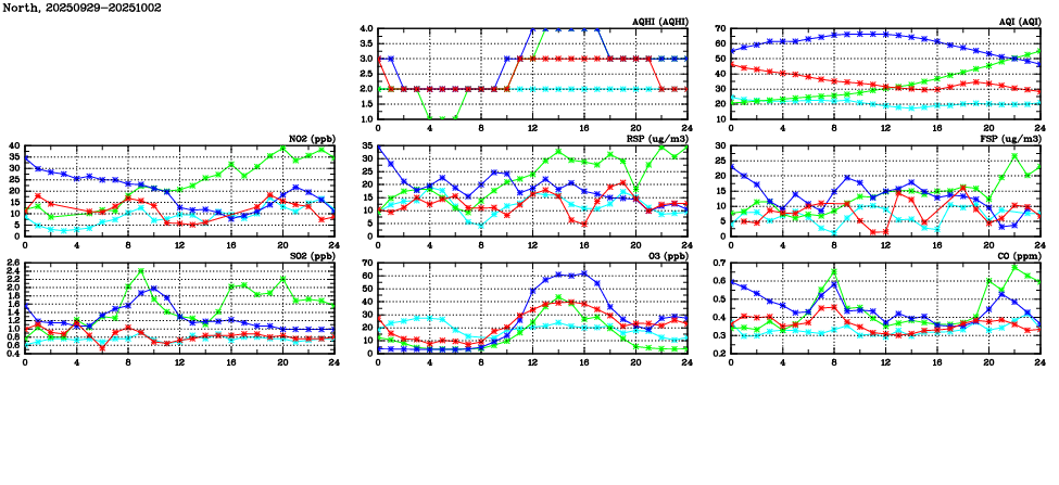 Air Quality Data Time Series in North (2025/10/02) | ( Line colors: Day -3 Day -2 Day -1 Current day ) | 2D Map Current AQHI |