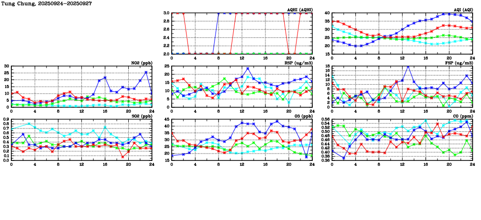 Air Quality Data Time Series in Tung Chung (2025/09/27) | ( Line colors: Day -3 Day -2 Day -1 Current day ) | 2D Map Current AQHI |