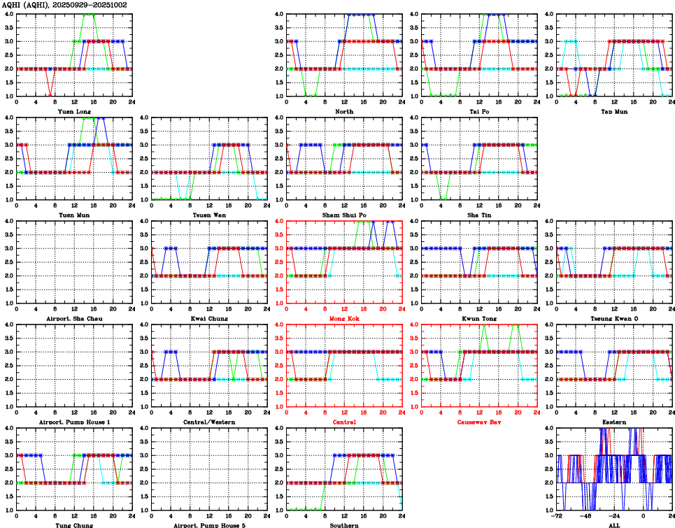 Air Quality Data Time Series for AQHI (2025/10/02) | ( Line colors: Day -3 Day -2 Day -1 Current day ) | 2D Map Current AQHI |