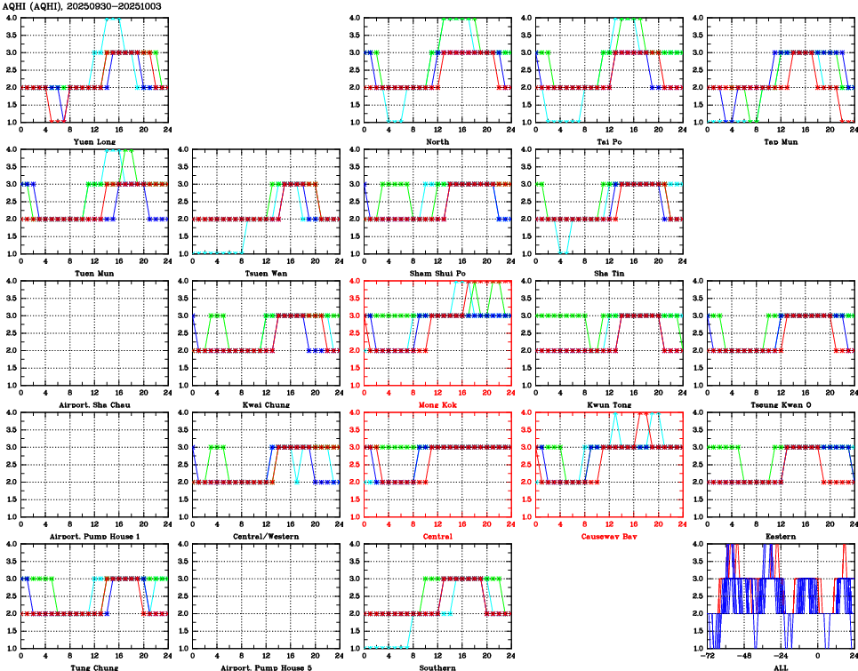 Air Quality Data Time Series for AQHI (2025/10/03) | ( Line colors: Day -3 Day -2 Day -1 Current day ) | 2D Map Current AQHI |