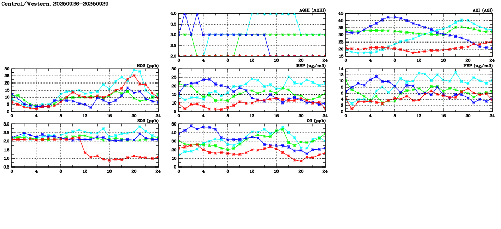 Air Quality Data Time Series in Central/Western (2025/09/29) | ( Line colors: Day -3 Day -2 Day -1 Current day ) | 2D Map Current AQHI |