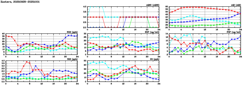 Air Quality Data Time Series in Eastern (2025/10/01) | ( Line colors: Day -3 Day -2 Day -1 Current day ) | 2D Map Current AQHI |